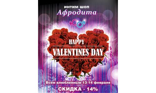 Каждый влюбленный знает об этом прекрасном дне. Мы, «Афродита», ценим и любим своих покупателей и стараемся сделать все, чтобы Вы дарили друг другу любовь.Для того, чтобы в день влюбленных, Ваша любовь стала еще сильнее, сеть интим бутиков «Афродита» подготовила особенное меню на которое распространяется СКИДКА в размере - 14%.